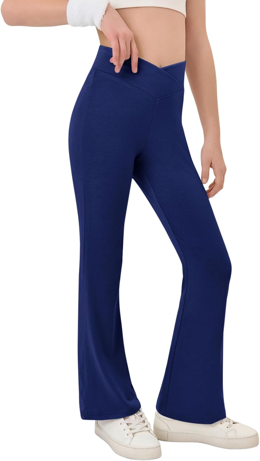 Haloumoning Girls Crossover High Waisted Flare Pants Kids Bootcut Leggings Full Length Bell Bottoms 5-14 Years