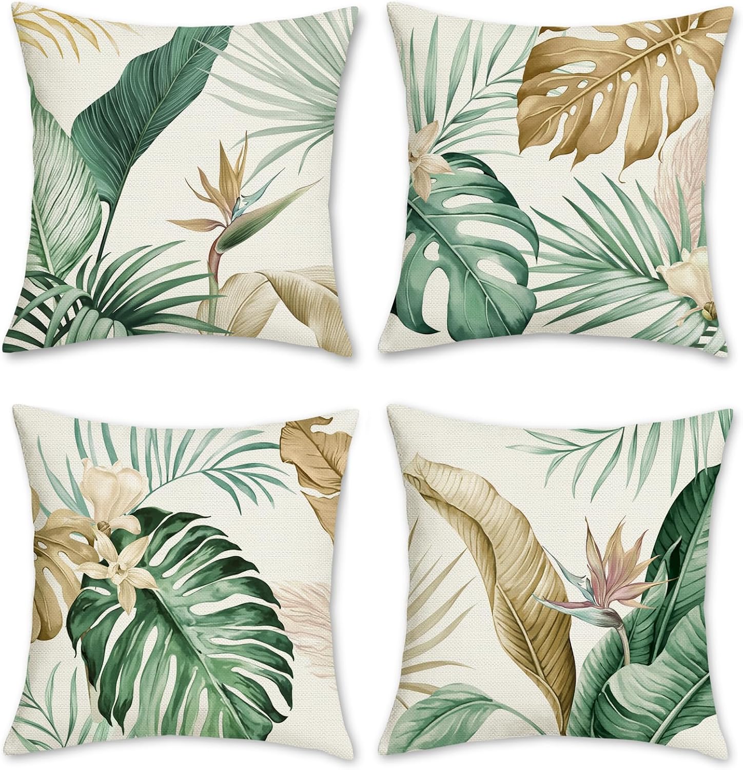 Bonhause Tropical Leaves Throw Pillow Covers 18 x 18 Inch Green Brown Leaf Decorative Pillow Cases Polyester Linen Outdoor Cushion Covers for Sofa Bed Home Decor Set of 4