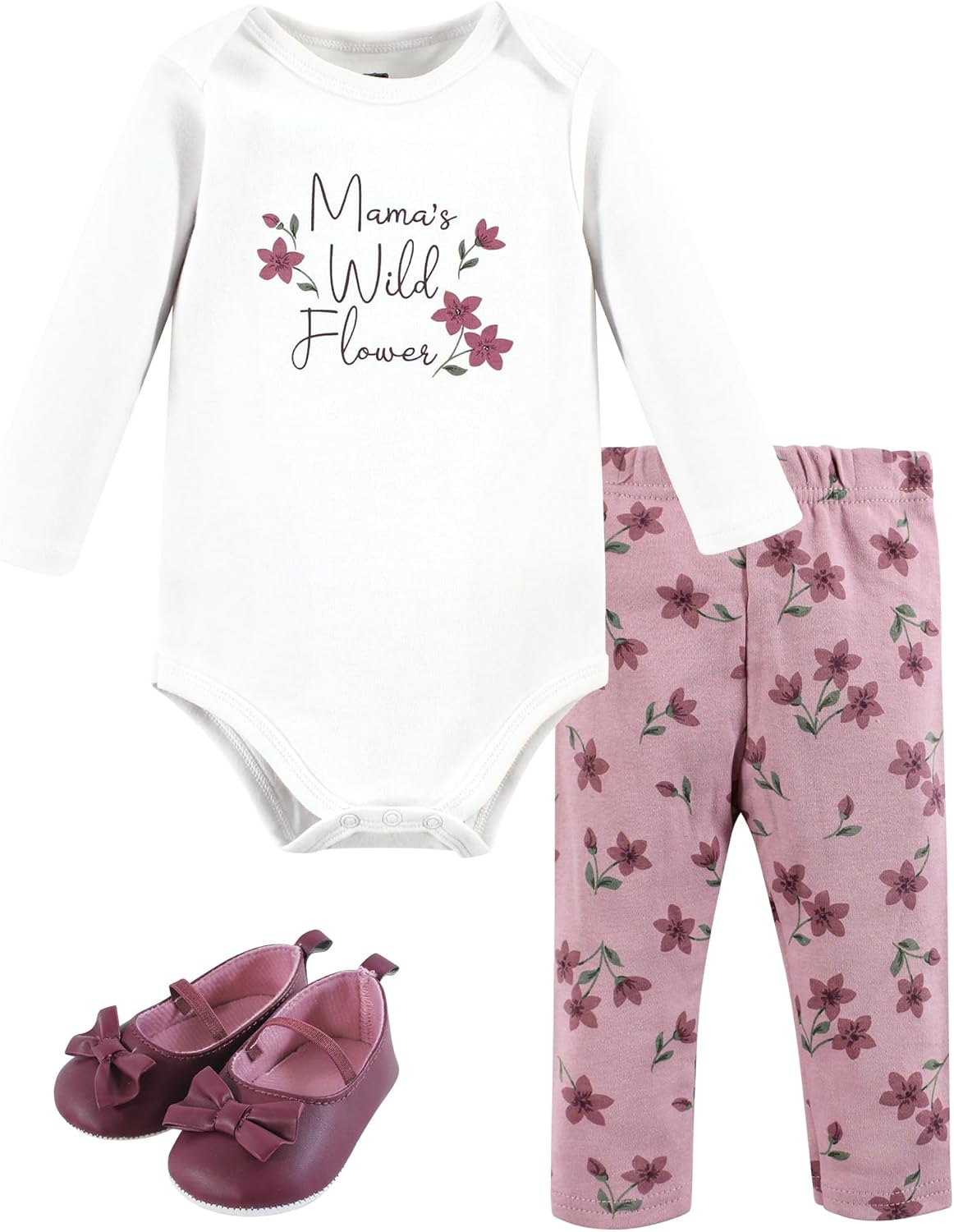 Hudson Baby Unisex Baby Cotton Bodysuit, Pant and Shoe Set, Plum Wildflower, 12-18 Months
