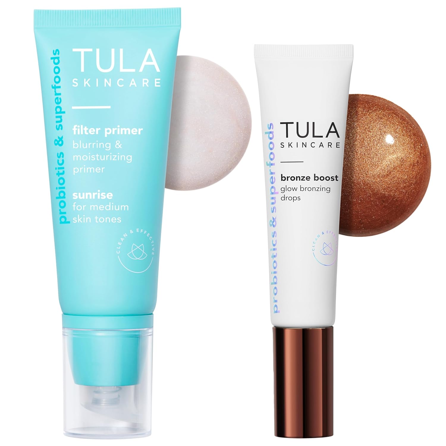 TULA Skin Care Face Filter Blurring and Moisturizing Primer, 1fl oz + Bronze Boost Glow Bronzing Drops 1 Fl Oz., 2 Piece Set