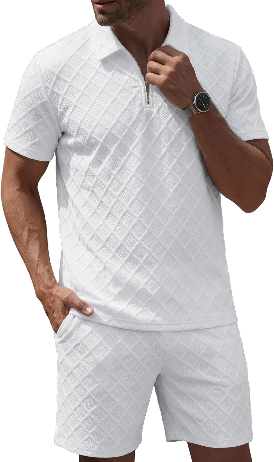 JMIERR Mens 2 Piece Jacquard Knit Outfits 1/4 Zip Golf Polo Shirt Shorts Set Casual Tracksuits for Beach Daily