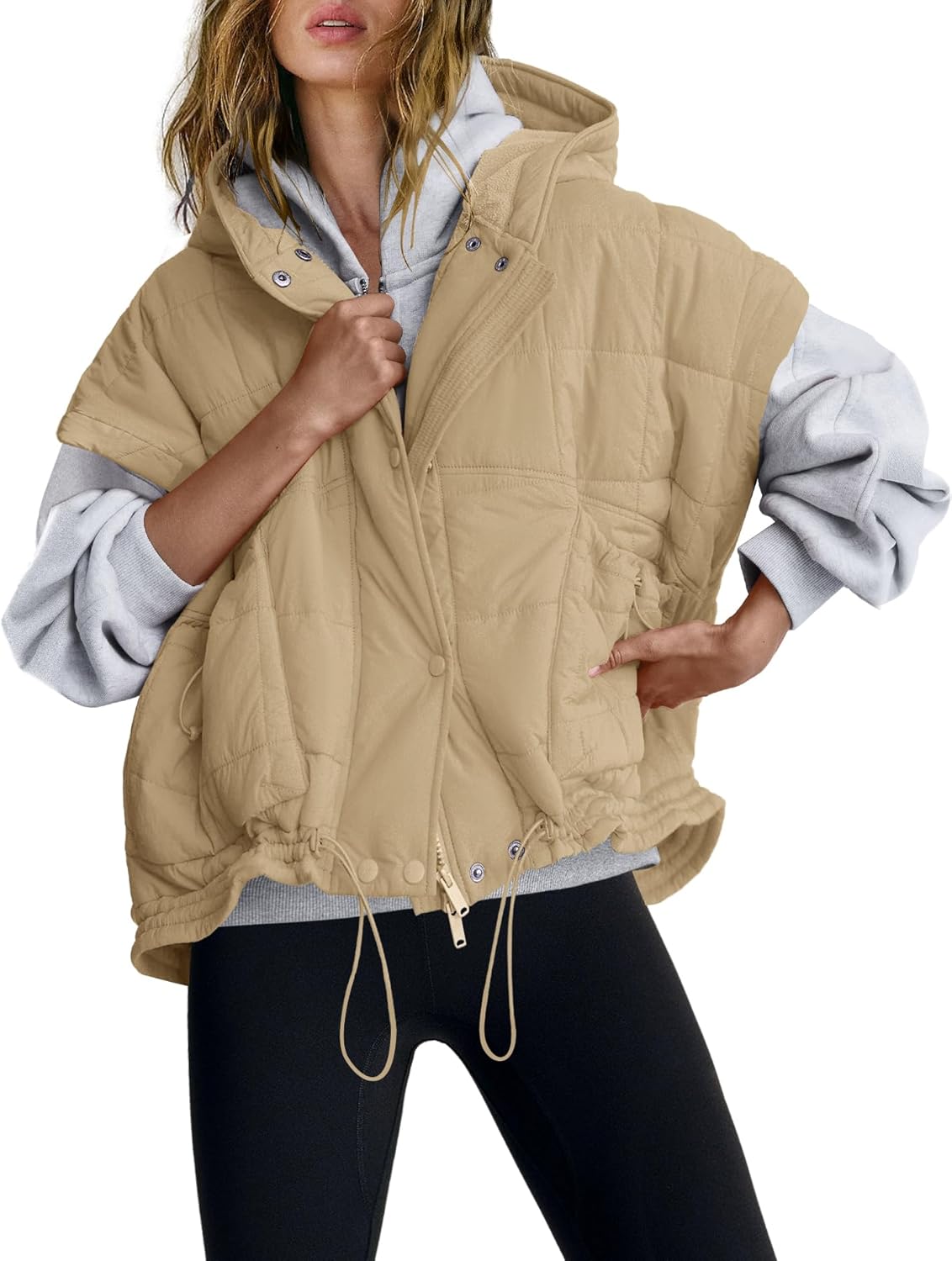 Nirovien Womens Oversized Puffer Vest Sleeveless Quilted Jackets Button Zip Up Hoodie Poncho Coats with Pockets