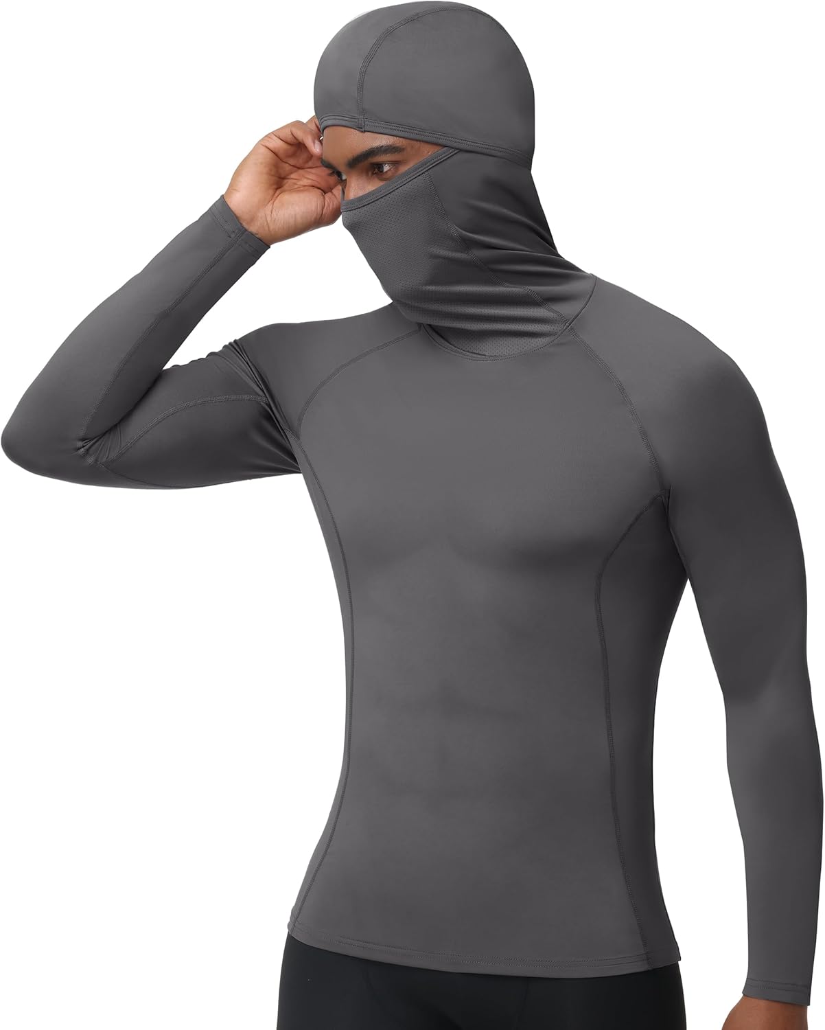 Men's Compression Shirt Hoodie with Mask, Long Sleeve Athletic Base Layer Top, Cool Dry Workout Sports Undershirt