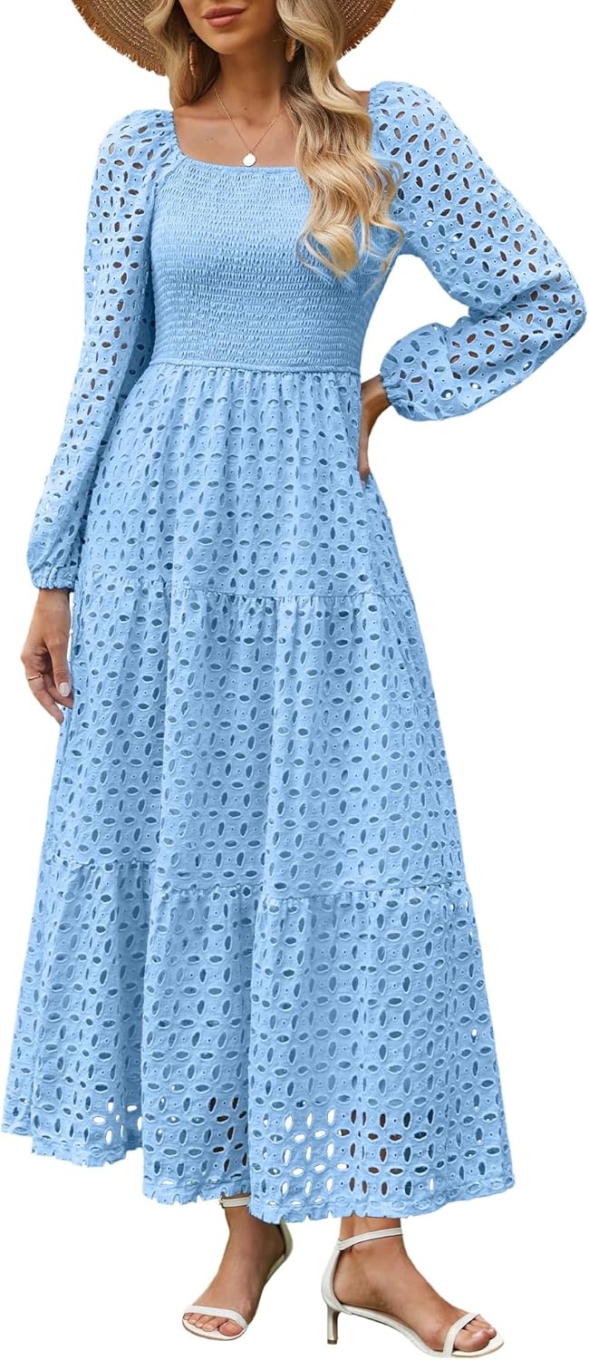 Women's Fall Long Puff Sleeve Maxi Dress Smocked Square Neck Lace Hollow Out Eyelet A Line Boho Flowy Wedding Guest Dresses