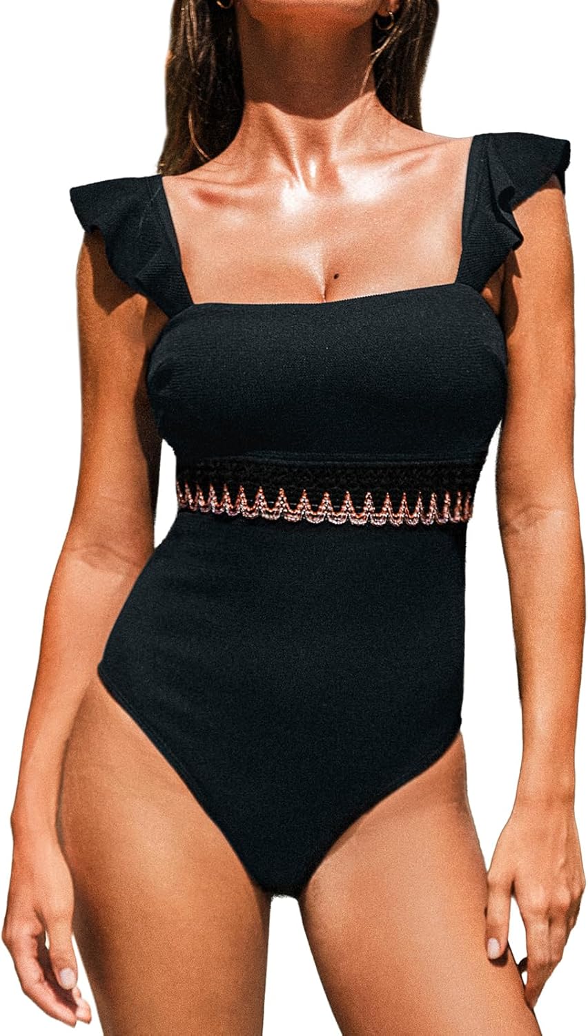 CUPSHE Women's One Piece Swimsuit Square Neck Ruffled Bathing Suit Stitching Cutout Adjustable Straps Self Tie Textured