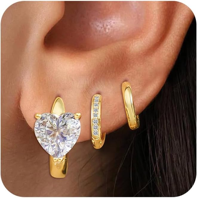 3Pairs Small Gold Huggie Hoop Earrings for Women,Romantic heart,Twisted braid two colors,3 CZ Hoop,5 Round Zircon Sport Hoops Earrings Set,14K Gold Filled Silver Hypoallergenic Earring Excellent gift