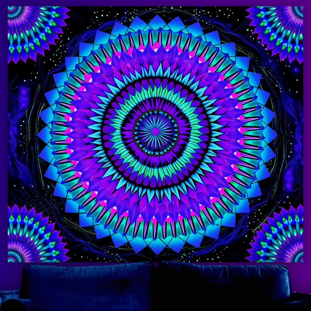 WEBEEDY Mandala Glow in The Dark Tapestry Black Light Bohemian Aesthetic Tapestry UV Reactive Boho Flower Wall Hanging Poster Backdrop for Bedroom Living Room Dorm Decor,59"X51"/150X130cm