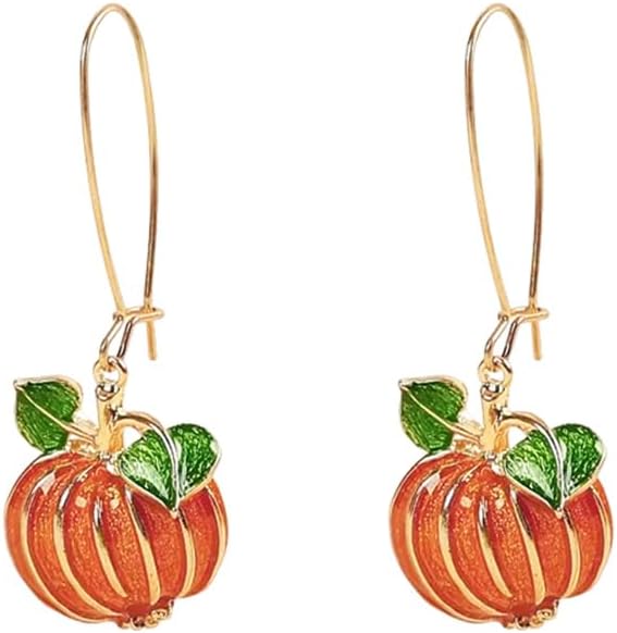 Cute Pumpkin Dangle Drop Earrings for Women Dainty Gold Plated Orange Enamel Green Leaf Halloween Thanksgiving Party Lightweight Dangling Hypoallergenic Fashion Trendy Jewelry