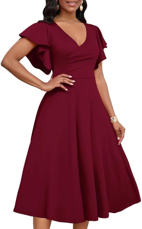 Women's Cocktail Midi Dress Elegant V Neck Ruffle Short Sleeve Wrap Wedding Guest Semi Formal A Line Dress