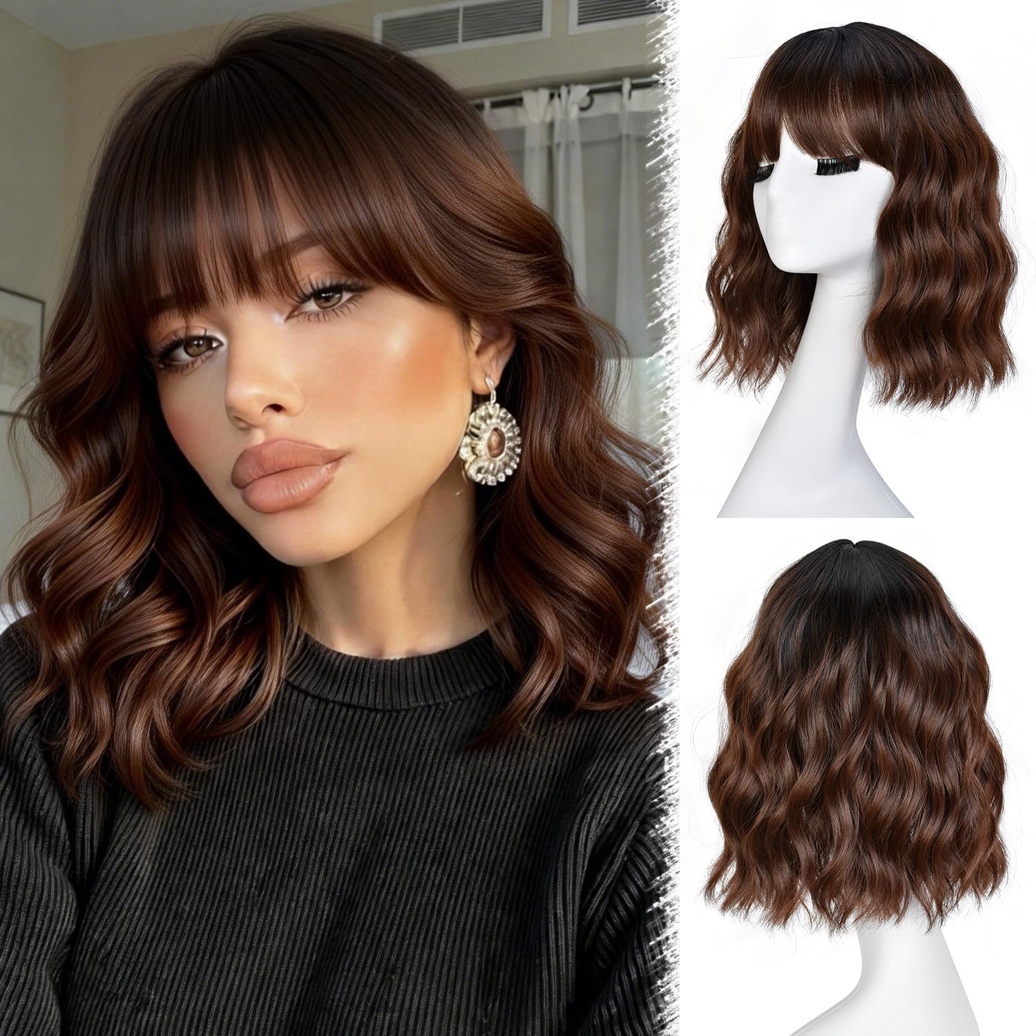 - Suitable for multiple scenarios:Short Wavy Wig with Bangs,transformed in one second,suitable for parties,weddings,graduations,birthdays,travel,celebrations,and daily life.
