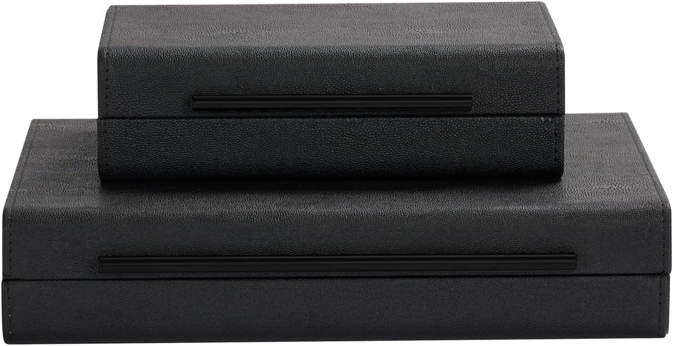 KIngflux Shagreen Decorative Boxes Set of 2-Modern Faux Leather Jewelry Orgazier, Engineered Wood Keepsake Boxes With Black Metal Handles for Home Decor Living Room Console Table, Gift (Black)