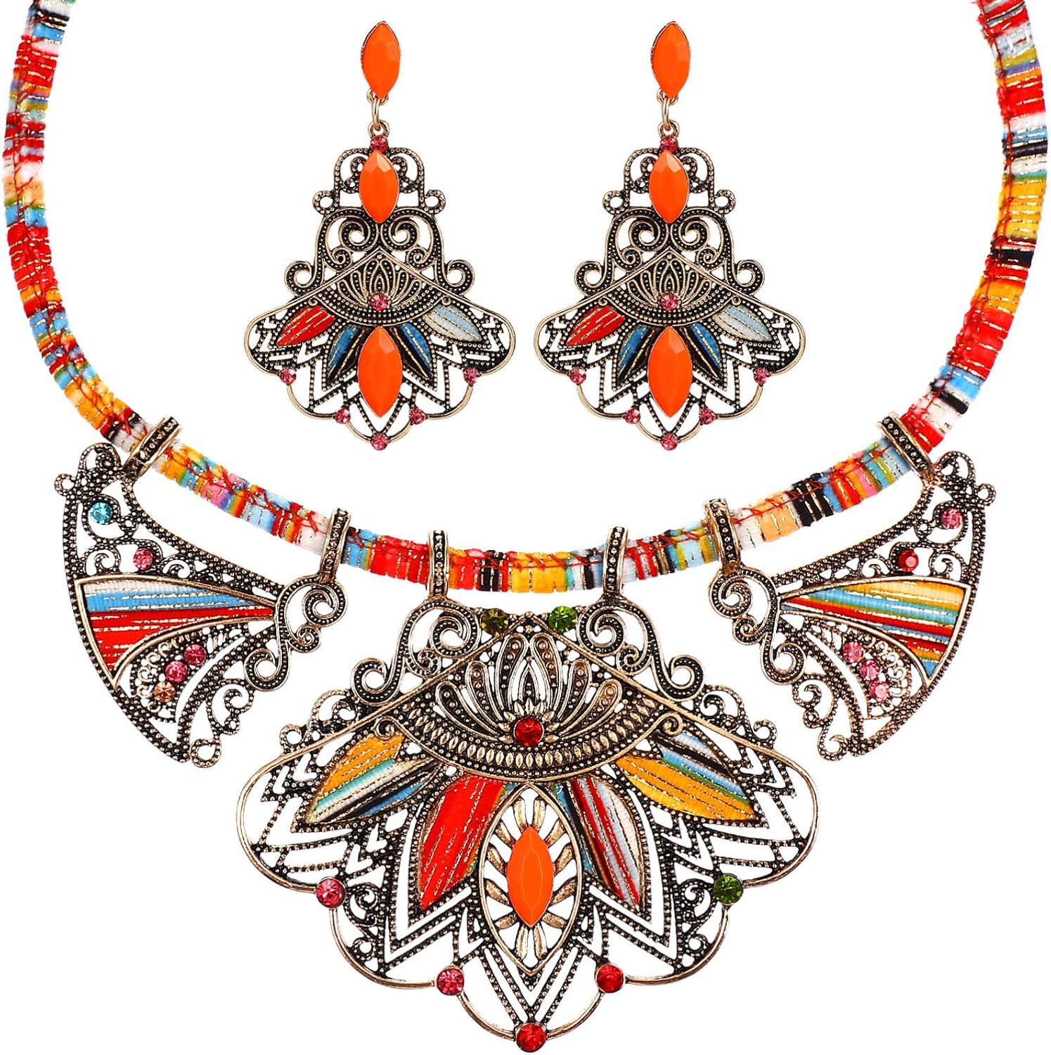 LUOEM Bohemian Jewelry Set Women Colorful Resin Bib Necklace and Earrings Set Ethnic Style Statement Necklace Earrings for Weddings Parties Everyday Wear