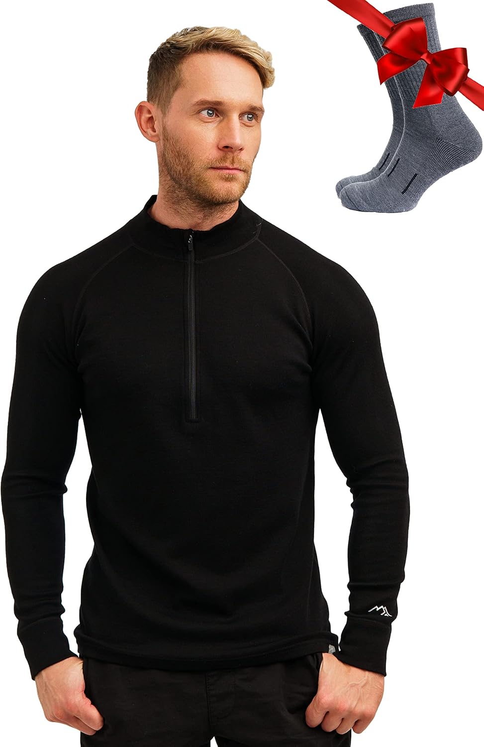 Merino Wool Base Layer Mens - Wool Half Zip Sweater Men - Merino Quarter Zip Sweater Lite, Midweight, Heavyweight and Socks