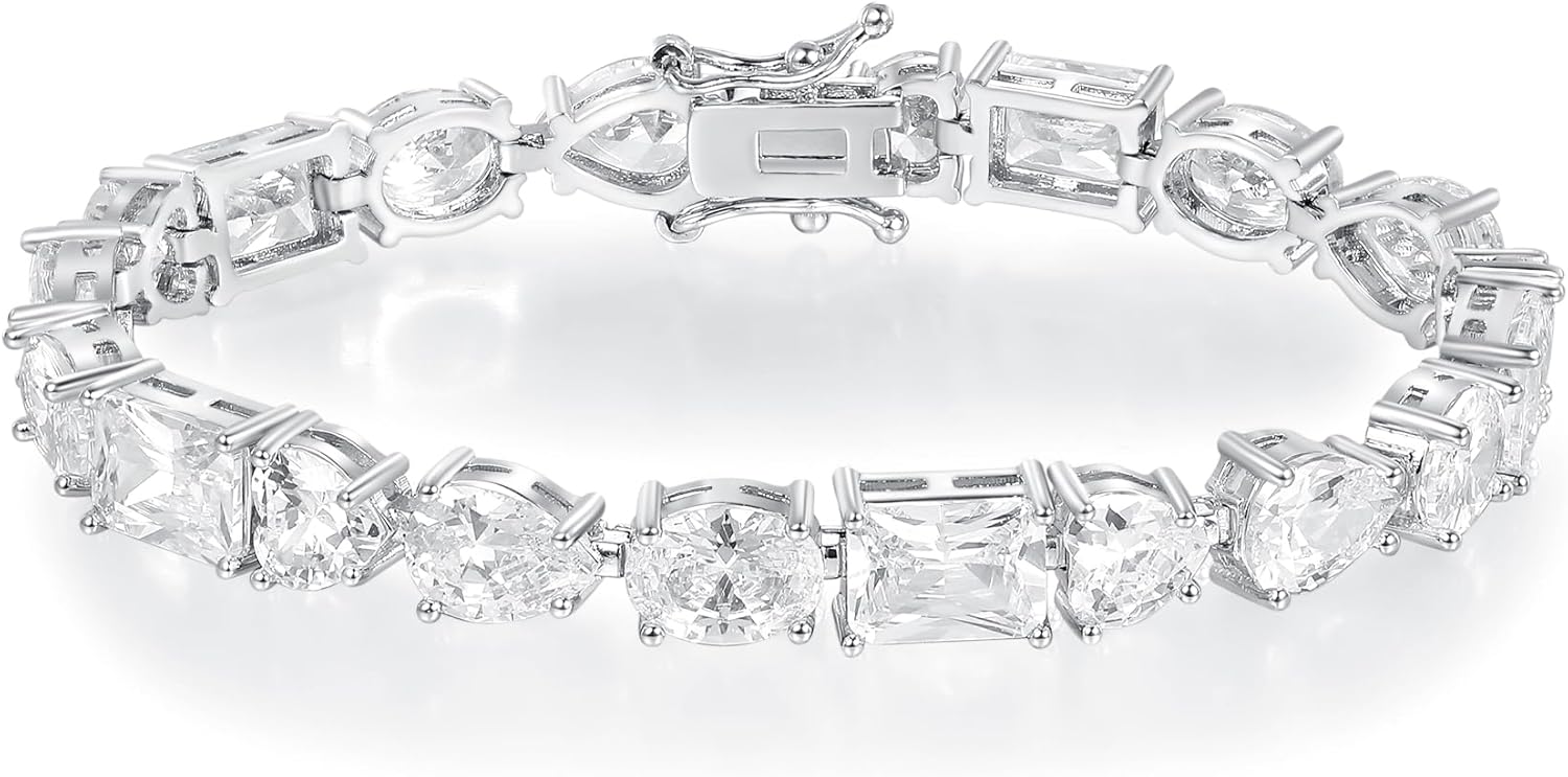 MDFUN 14K White Gold Plated Tennis Bracelet with Heart Oval Teardrop Rectangle Cut Cubic Zirconias for Women Men, 6.5-7.5 inches