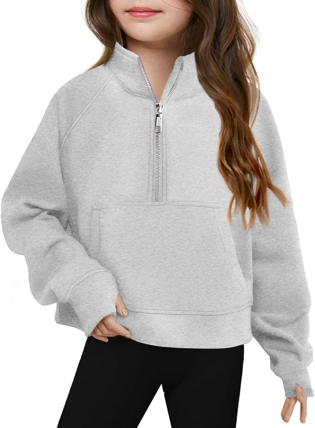 Haloumoning Girls Half Zip Sweatshirt Long Sleeve Pullover Crop Tops Kids Lightweight Fleece Fashion Winter Clothes