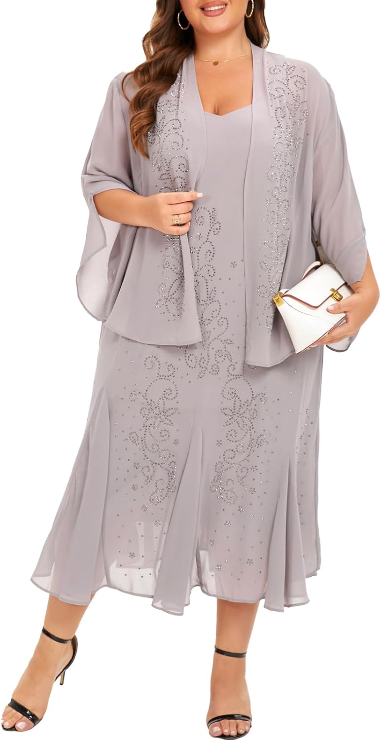 Plus Size Jacket Dress Suits 2 Piece Chiffon Sets Delicate Rhinestone Pattern Mother of Bride Dresses for Wedding
