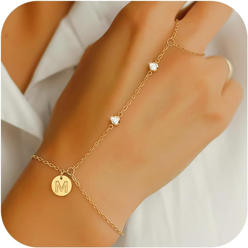 Hand Chain Bracelets for Women | Cute Initial A-Z Ring Bracelets | 18k Hand Chain Finger Ring Bracelet, Cubic Zircon Hand Jewelry for Women