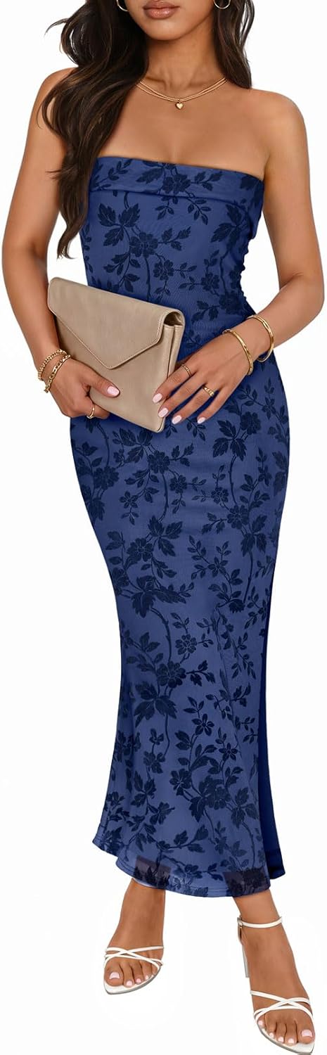 MEROKEETY Women's 2026 Summer Floral Strapless Dress Bodycon Tube Slit Mesh Wedding Guest Cocktail Party Maxi Dresses