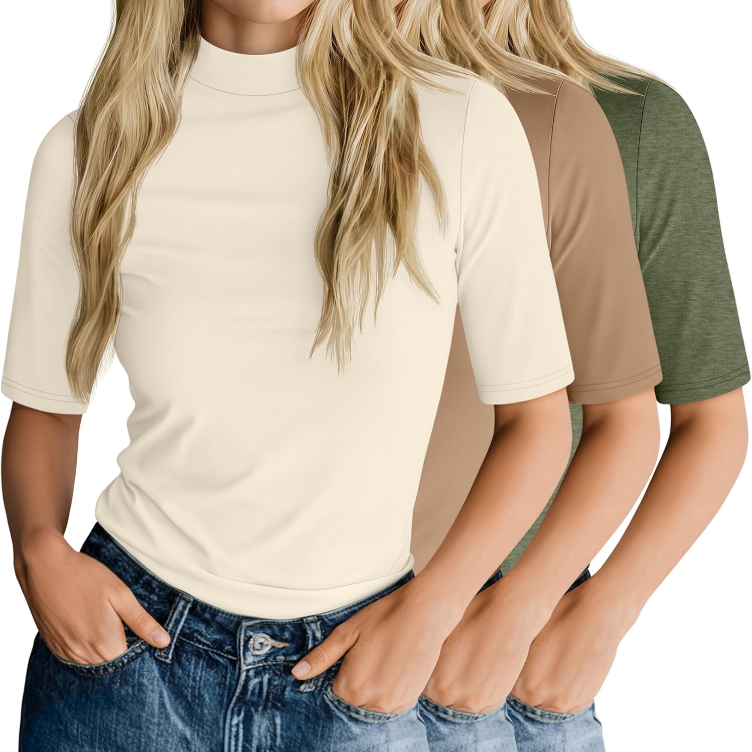 Ficerd 3 Pack Women's 1/2 Sleeve Mock Turtleneck Shirts, Elbow Length Shirt Half Sleeve Tunic Top Casual Summer Basic Tees