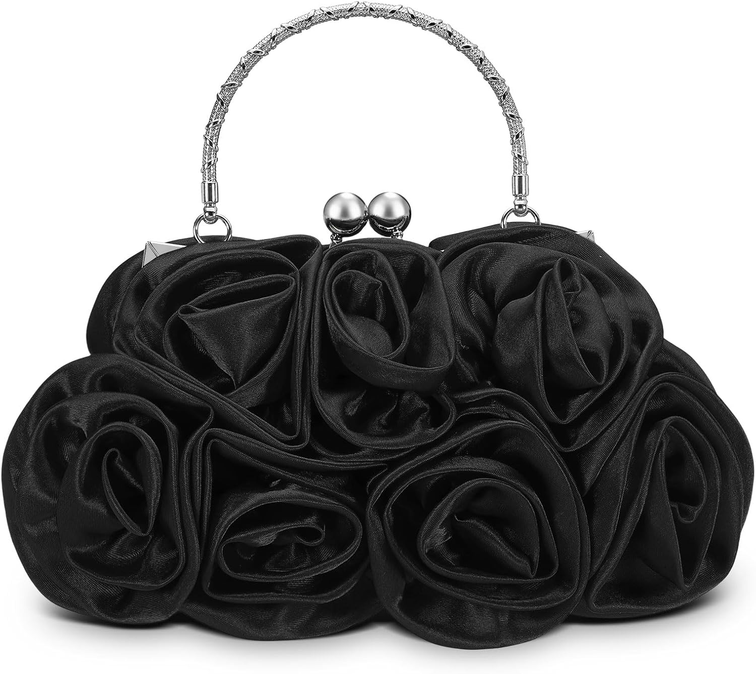 Rose Evening Bag Clutch Purse for Women, Satin Evening Purse W/3D Floral Rose for Formal Wedding Party Bride, Black
