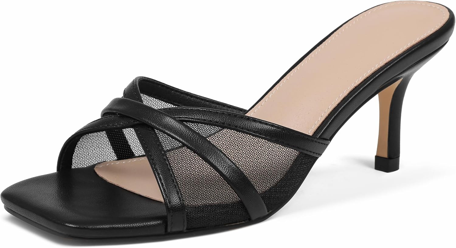 Eteridrey Kitten Heels for Women Mesh Heeled Sandals Square Open Toe Mule Heels Summer Comfortable Low Heel