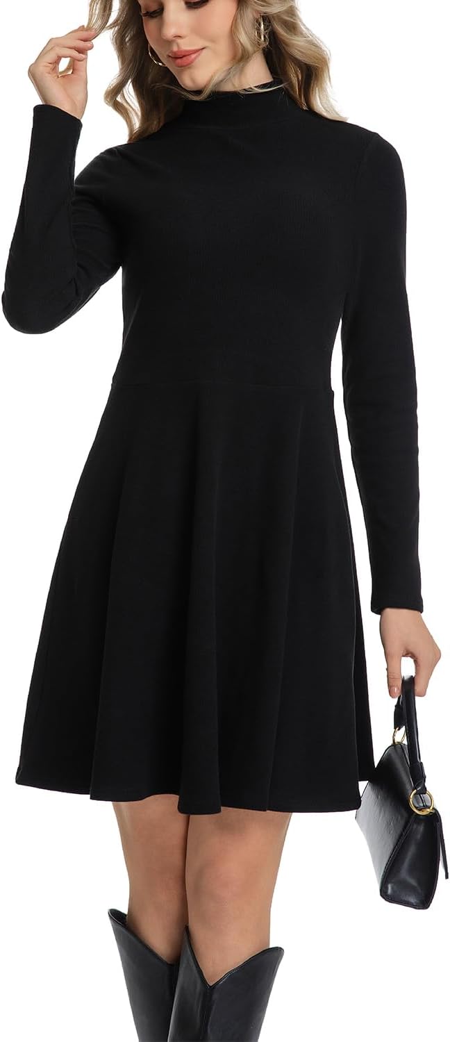 Long Sleeve Dress for Women Turtleneck Ribbed Knit A-Line Flowy Casual Elegant Fall Winter Fashion Short Dresses