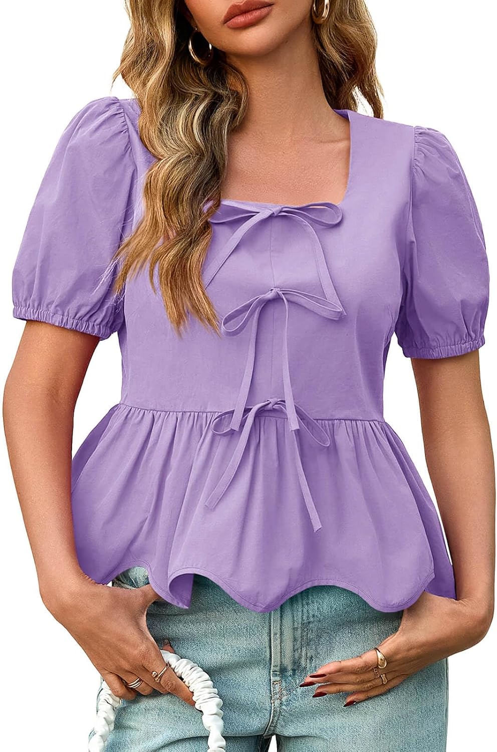 Tankaneo Womens Summer Peplum Babydoll Tops Square Neck Short Puff Sleeve Blouses Cute Ruffle Bow Shirts Purple