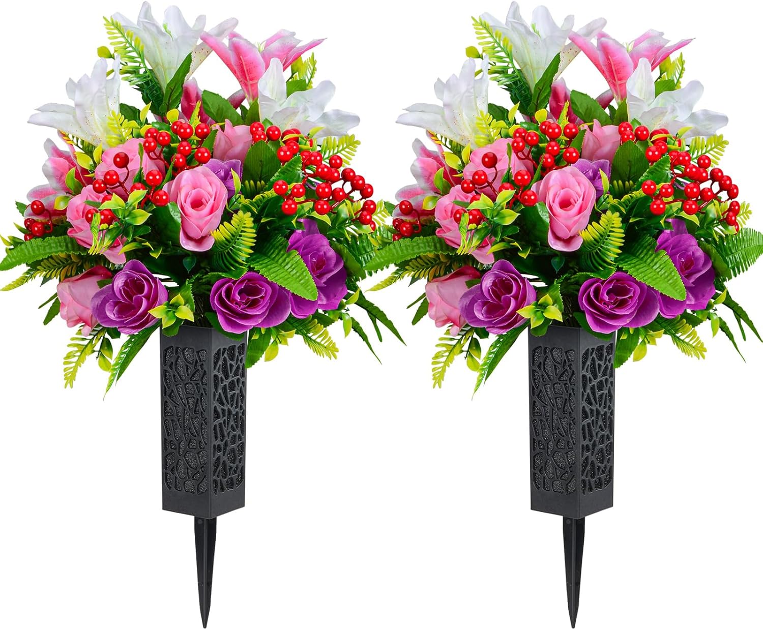 Set of 2 Artificial Cemetery Flowers, Artificial Rose Lily Grave Memorial Flowers with Black Plastic Vase for Cemetery Headstones Gravesite Decoration