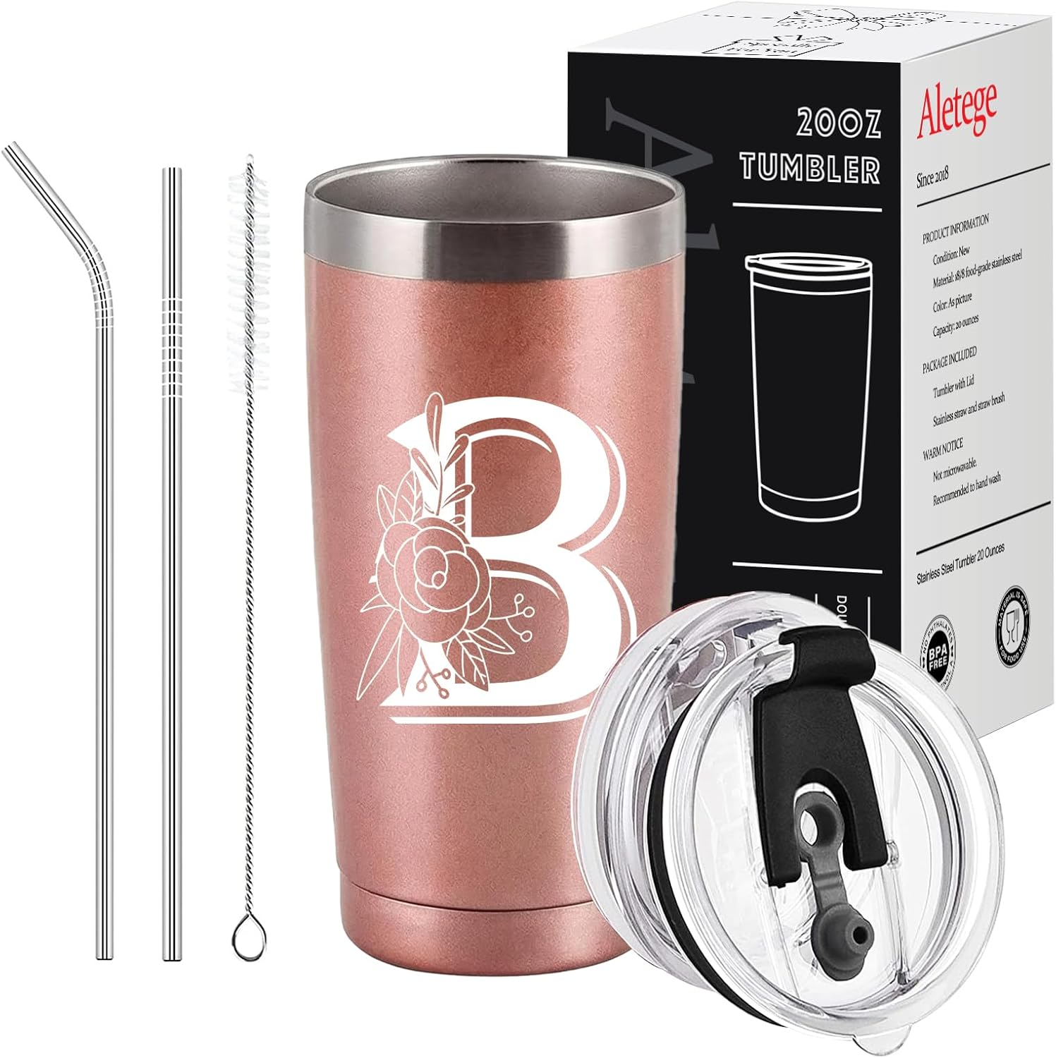 Letter B Insulated Travel Cup with Lid, Personalized Initial Mugs for Women, Letter B Gift Coffee Mugs for Women, Wife, Mom, Grandma, Bridal Shower Gifts, 20 OZ Rose Gold Two Lids