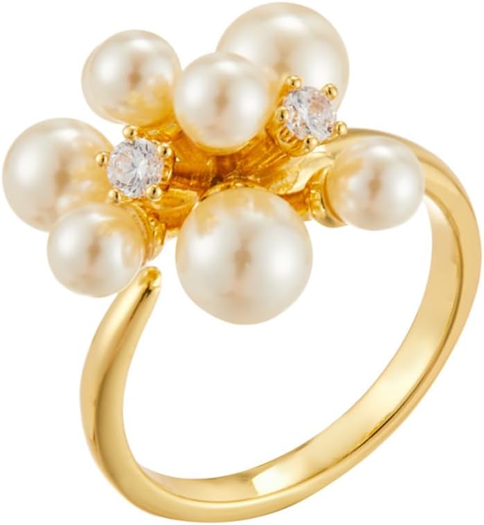 Kokoma Pearl Flower Statement Ring for Women Gold-Plated Cubic Zirconia Bouquet Wrap Finger Band Promise Engagement Ring Wedding Bands