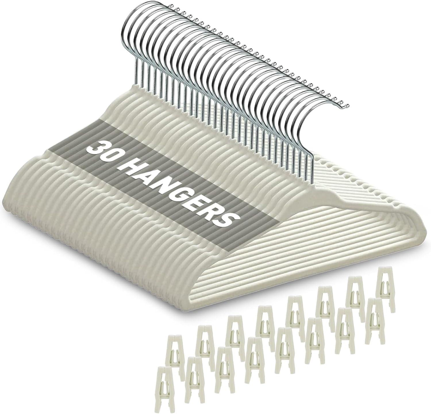Velvet Baby Hangers with Clips (30 Pack) | 11” Ultra-Slim Baby Clothes Hangers | Non-Slip Felt | Space-Saving Nursery & Infant Closet Organizer | Beige