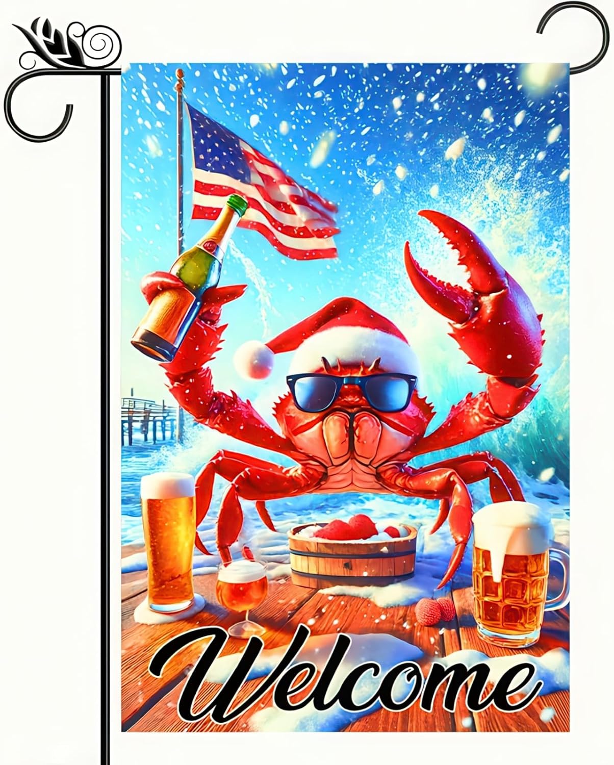 - Festive beach-crab artwork: this playful crab with sunglasses and drinks adds humor to merry christmas garden flag groupings supports christmas garden flag scenes enriches winter garden flag themes complements welcome garden flag displays and pairs well with farmhouse outdoor decor.
