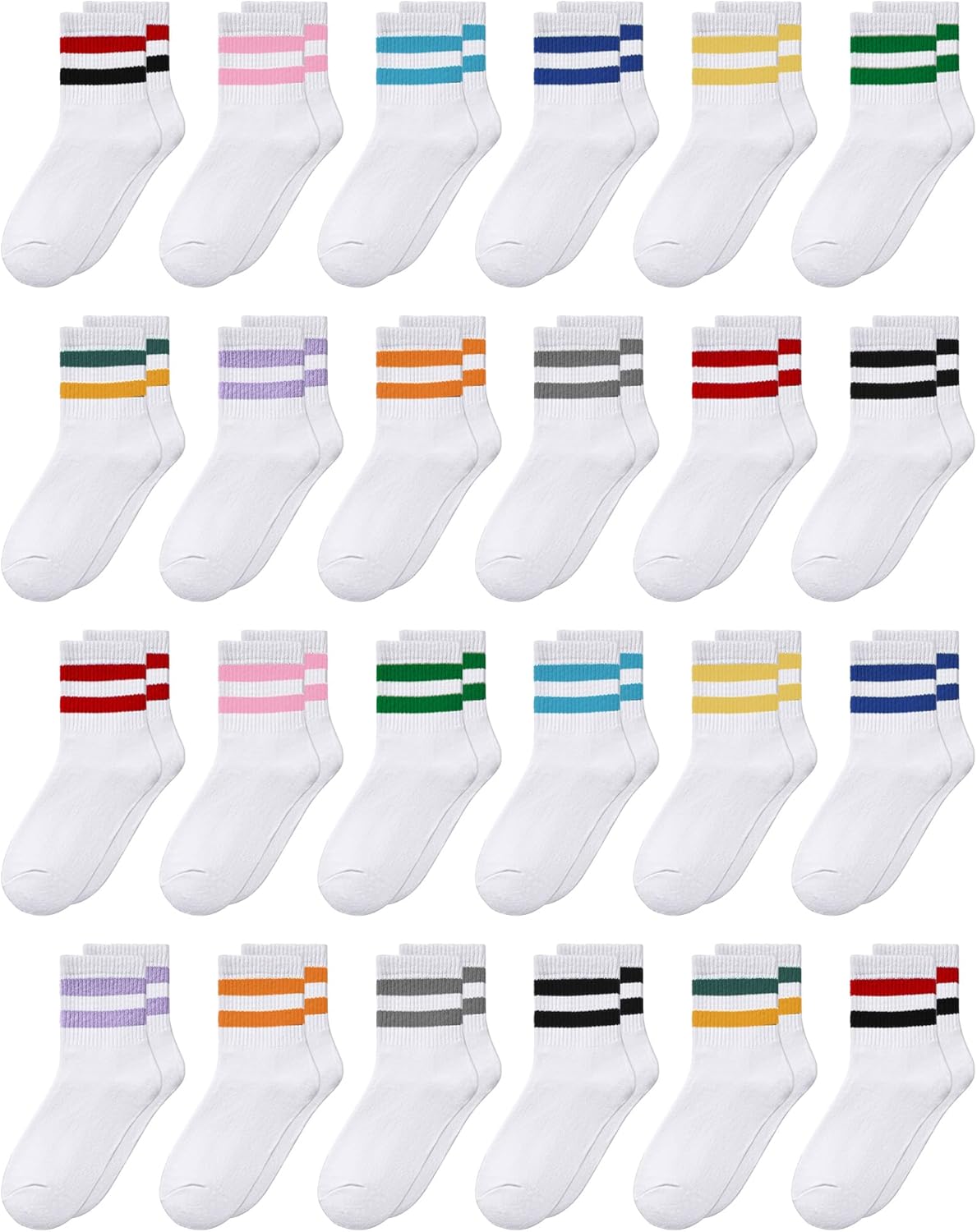 Eurzom 24 Pairs Kids Striped Crew Socks Boys Girls 6-10 Years Back to School Sporty Athletic Socks Colorful Retro Stripe Athletic Hosiery for Boys Girls School Daily Wear