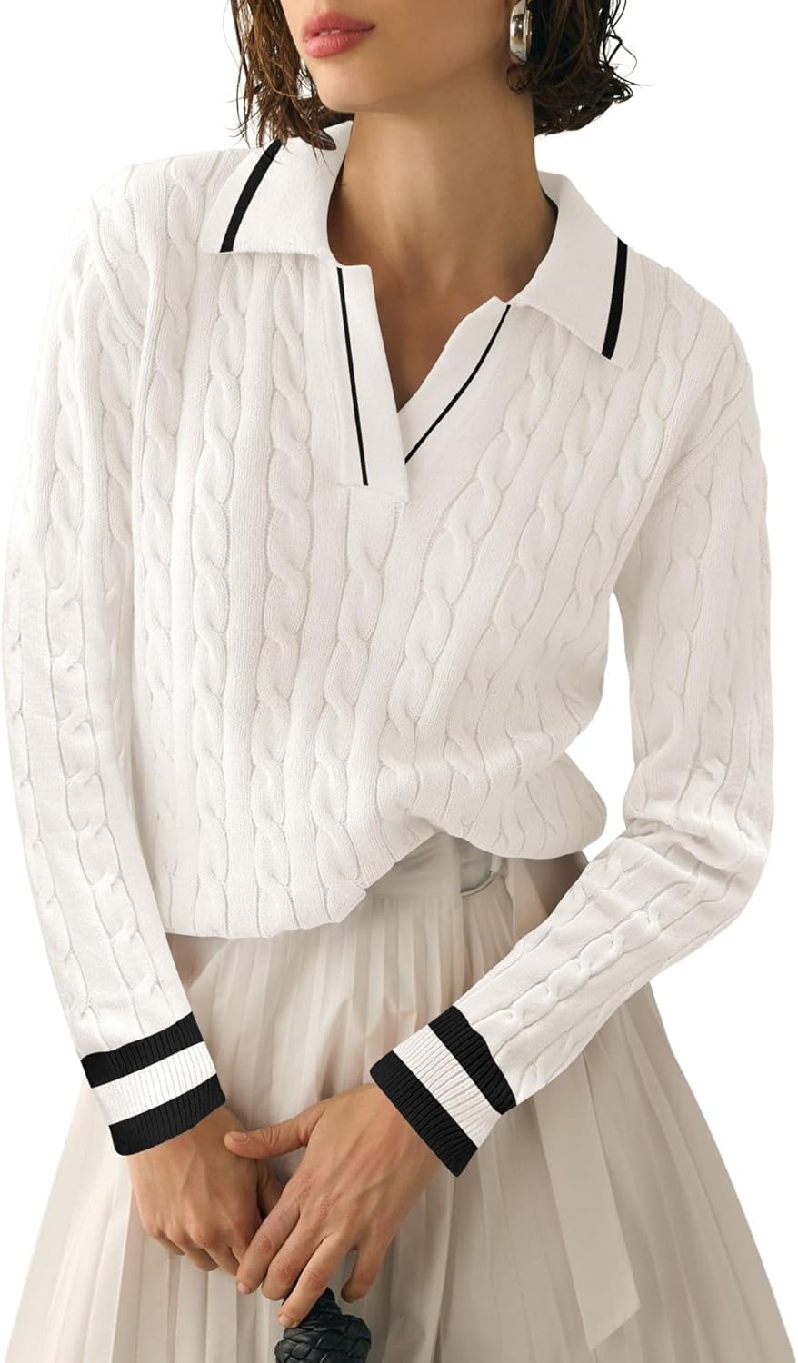 Micoson Womens Fall Long Sleeve Sweaters Lapel V Neck Cable Knitted Pullover Casual Soft Jumper Top