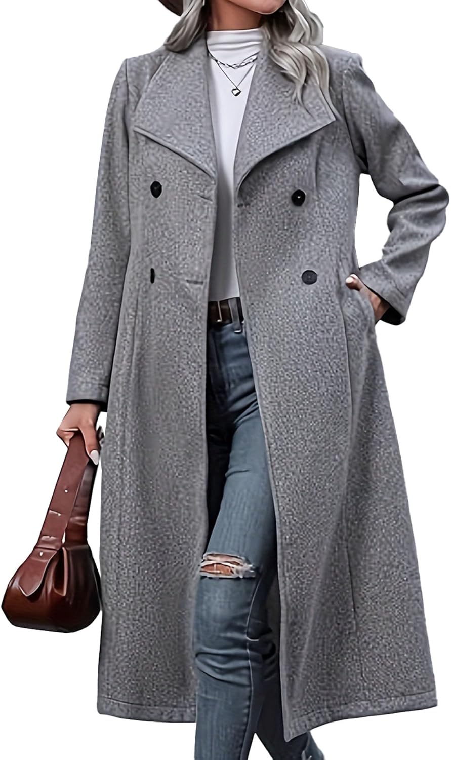 ECADHICC Womens Trench Coat Lapel Double Breasted Long Pea Coat Casual Work Office Overcoat with Pocket
