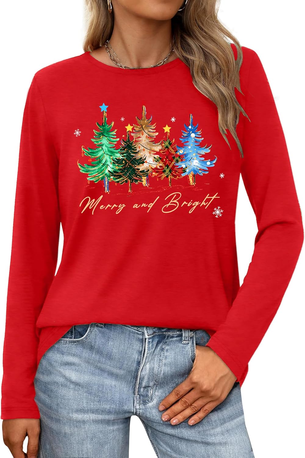 VVNTY Christmas Shirts for Women: Merry and Bright T Shirt Long Sleeve Christmas Tree Shirt Christmas Vacation Tees