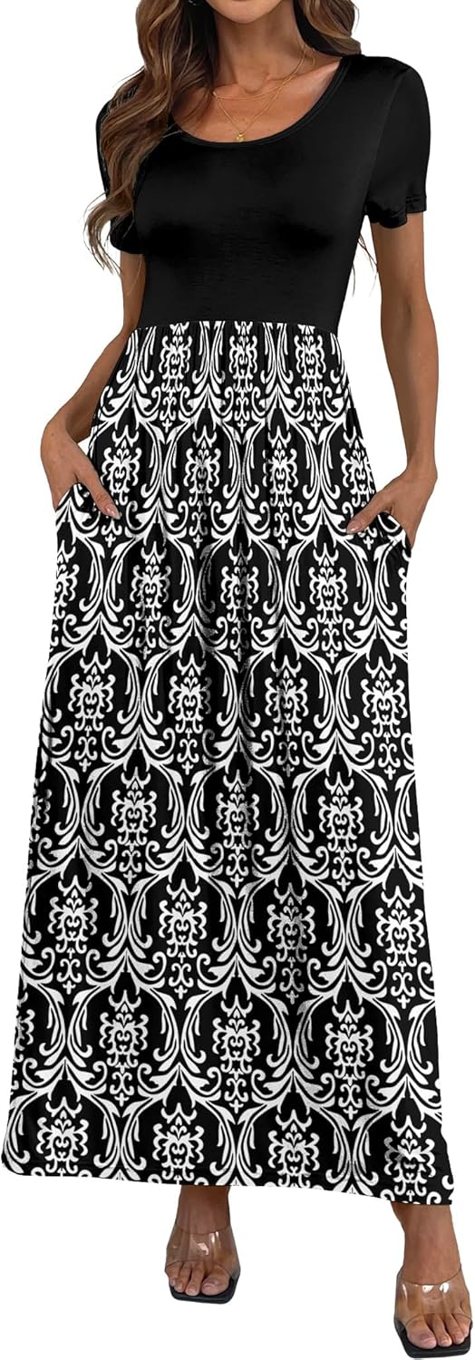 HAOMEILI Women's Short Sleeve Floral Print Scoop Neck Loose Plain Maxi Dresses Casual Long Dresses with Pockets(Black White 2XL)