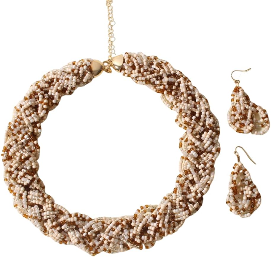 Caiyao Bohemia Multilayer Beaded Choker Necklaces Earrings Set Colorful Adjustable Crystal Rice Beads Chunky Necklace for Women Summer Beach Hawaiian Vacation Ethnic Jewelry Gifts