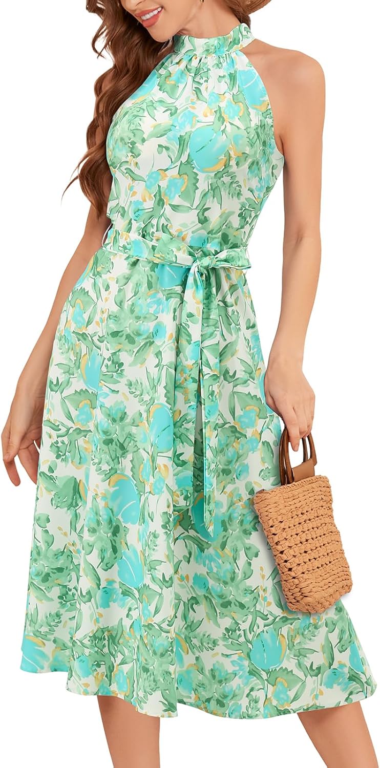 Bbonlinedress Women Halter Summer Floral Wedding Guest Dress Midi Casual Beach Vacation Flowy Boho Dress