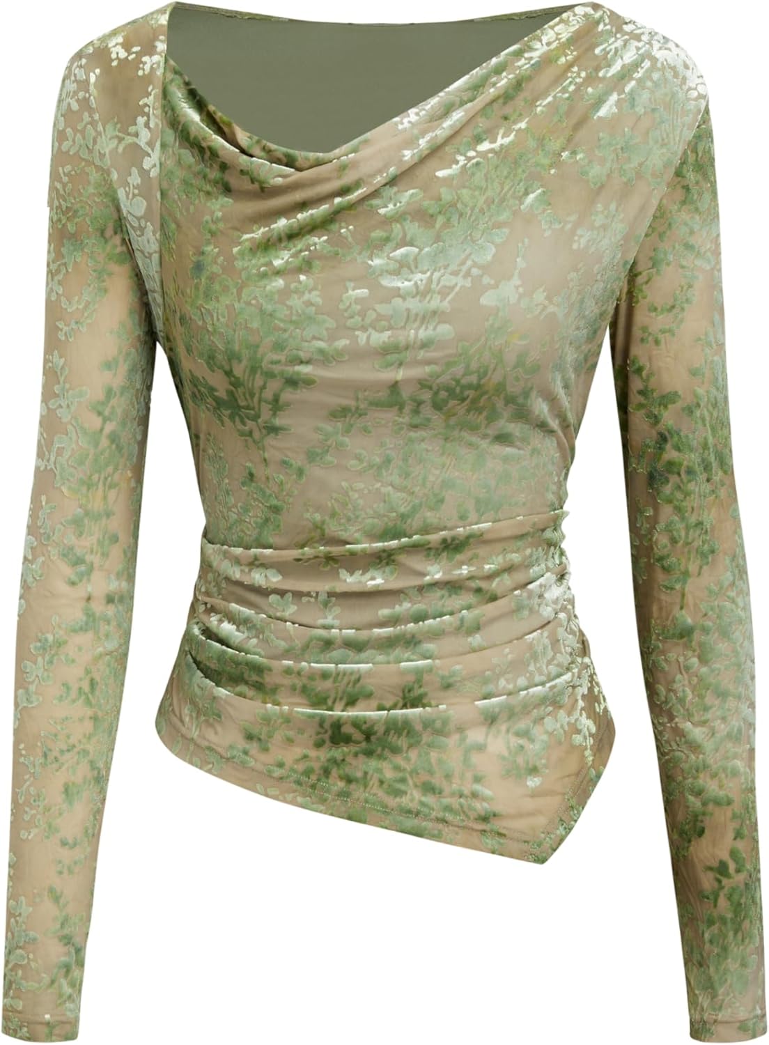 CIDER Going Out Tops for Women Floral Mesh Top Long Sleeve Asymmetrical Neck Ruched Slim Fit Top Trendy Fall Spring