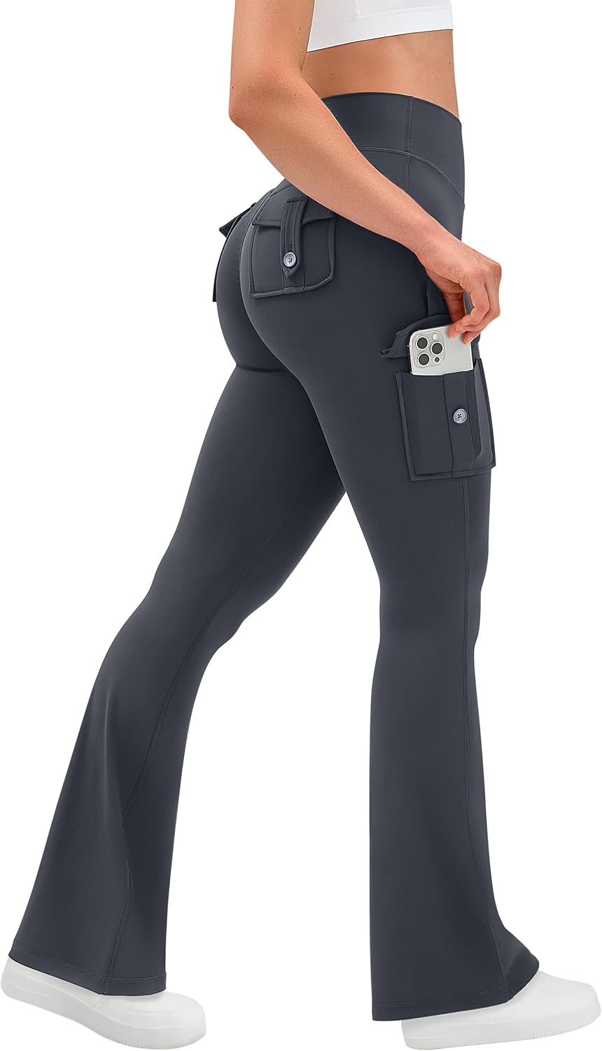 OLCHEE Womens Yoga Pants Flare Leggings with Cargo Pockets Scrunch Butt Lifting High Waist Tummy Control Gym Workout Bootcut