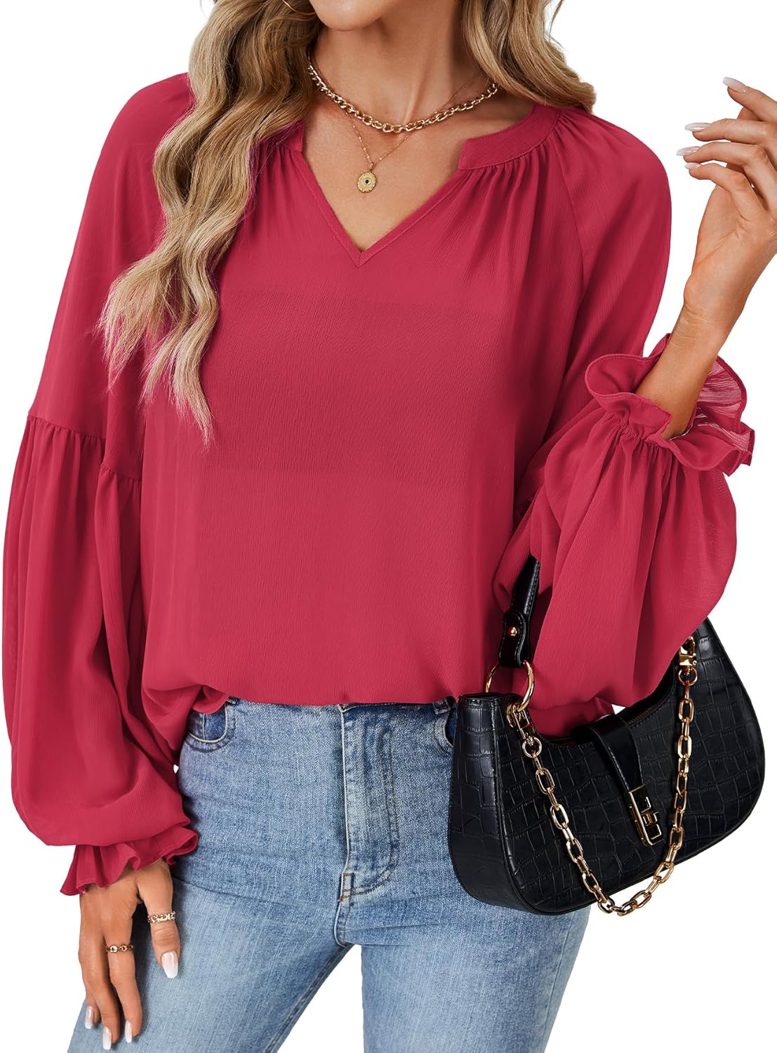 LYANER Women's Loose Casual V Neck Blouse Ruffle Trim Lantern Long Sleeve Shirt Top