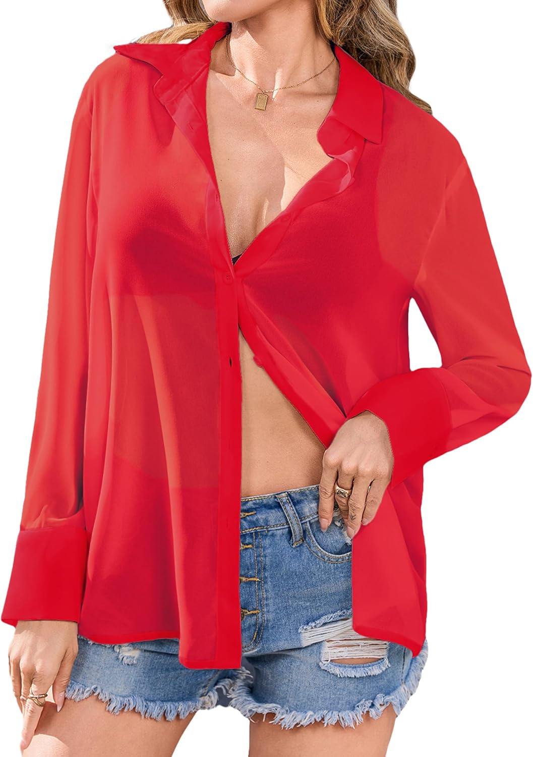 Totatuit Women's Sheer Button Up Blouse See Through Tops Sexy Button Down Shirt Beach Cover Up