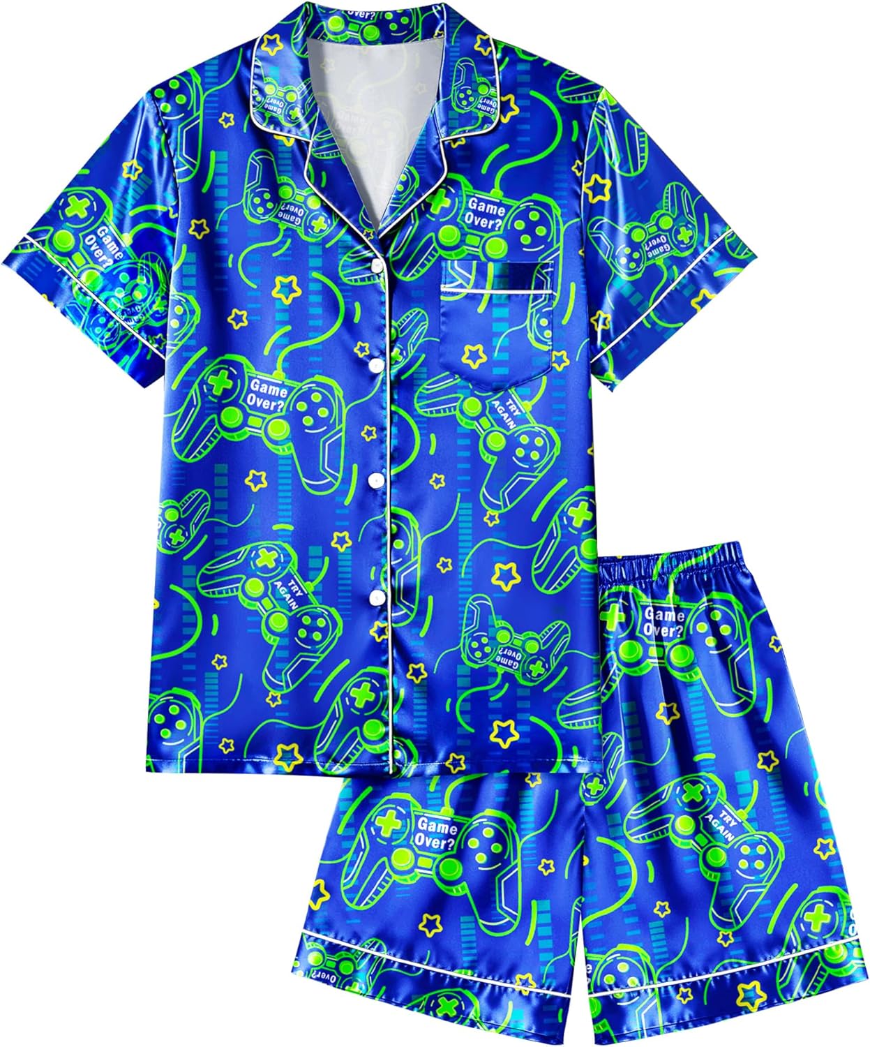 Fiodrimy Boys Pajamas Big Boys Satin PJS Set Summer Short Sleeve Button Down Kids Silky Pajama Lounge Sleepwear Size 8-14