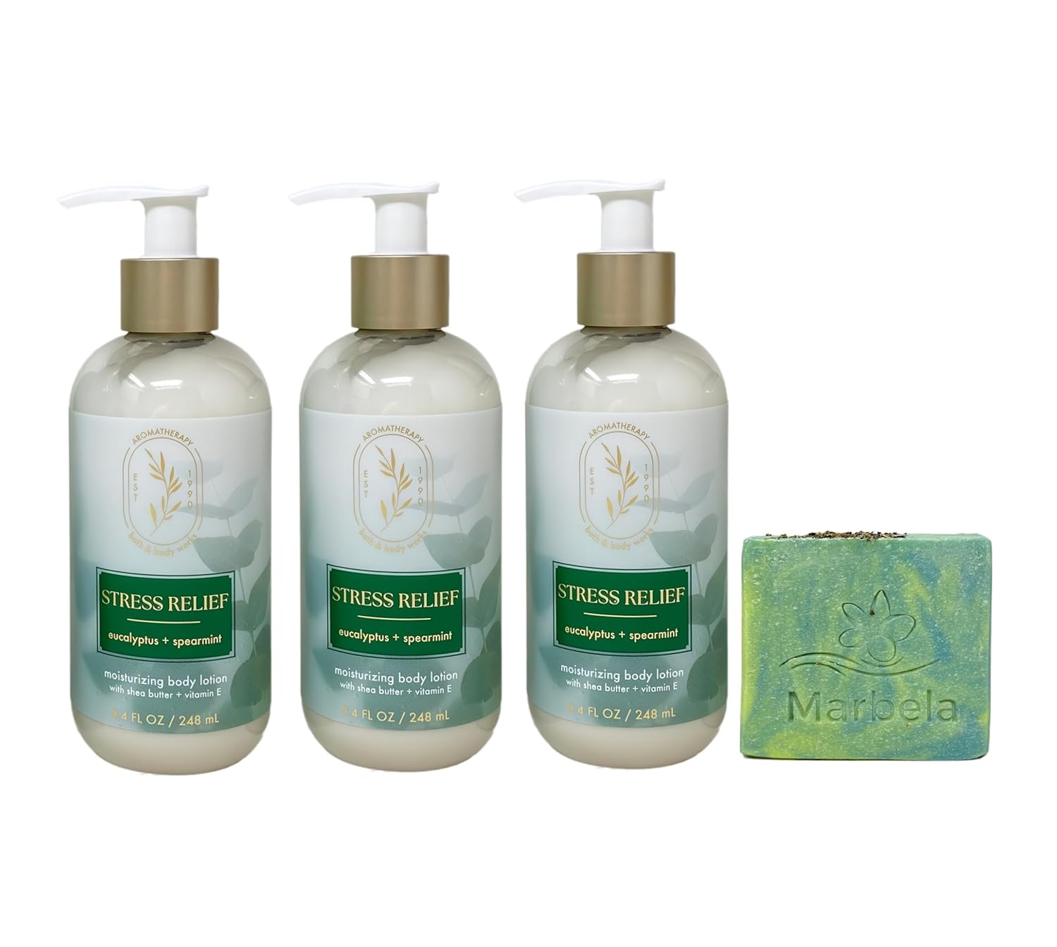 Bath & Body Works Aromatherapy Stress Relief Eucalyptus Spearmint - 3 Moisturizing Body Lotion - with a Fresh Forest Bar Soap