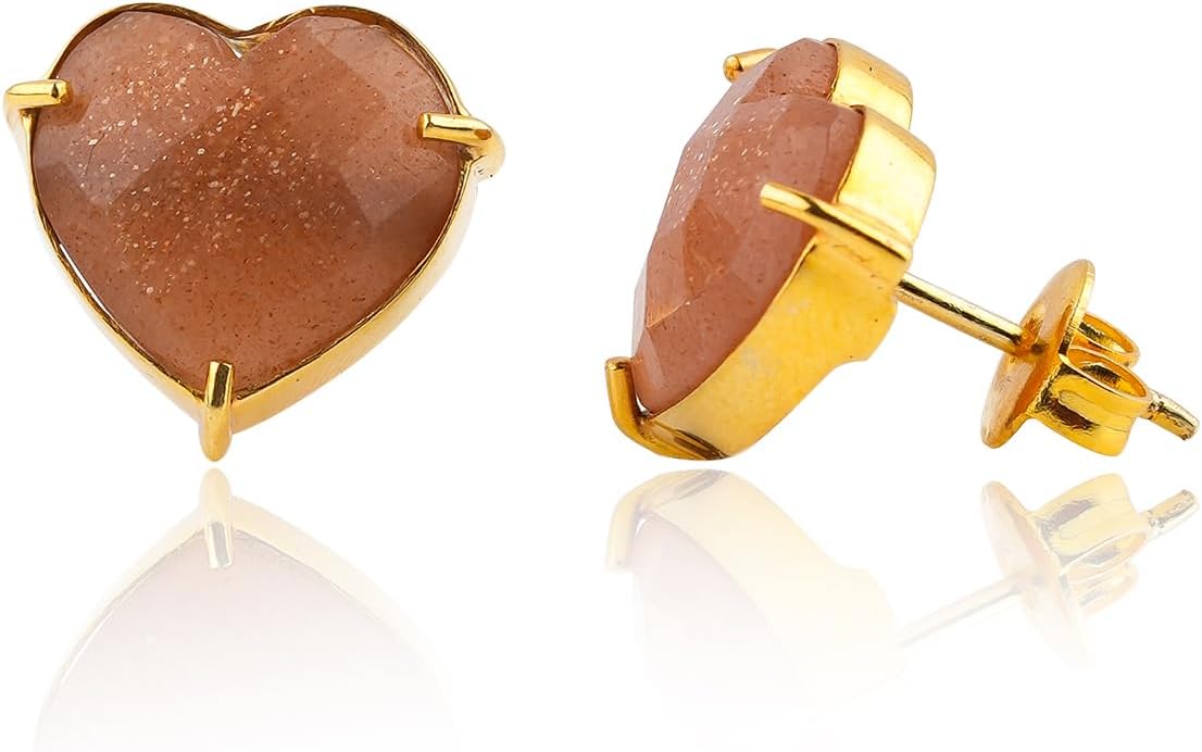 AAA Grade Natural Gemstone Stud Earrings – Handmade in Gold Plated | Healing Crystals | Classic Prong Earrings | Heart Shape Studs | Christmas Gift for Women