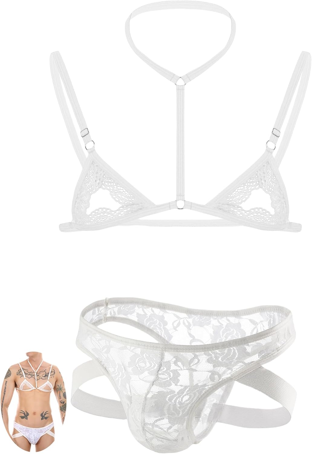 Men's Sissy Lace Lingerie Set with Sheer Bra Top & Panty Underwear Set 2-Piece Nightwear S-XL