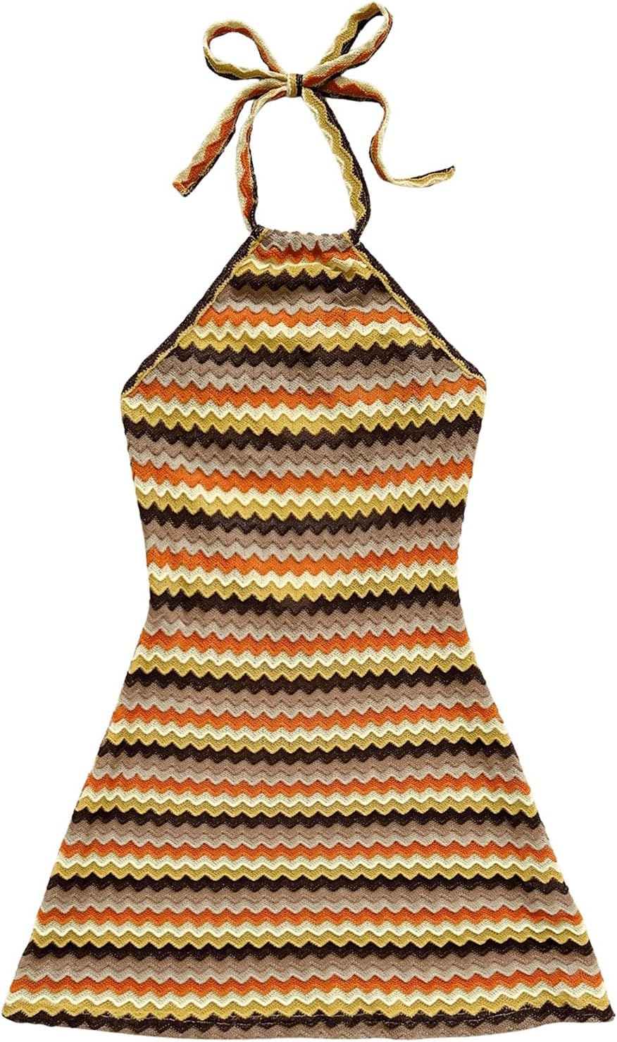 Verdusa Women's Boho 70s Cami Dress Striped Halter Backless Fitted Mini Dress