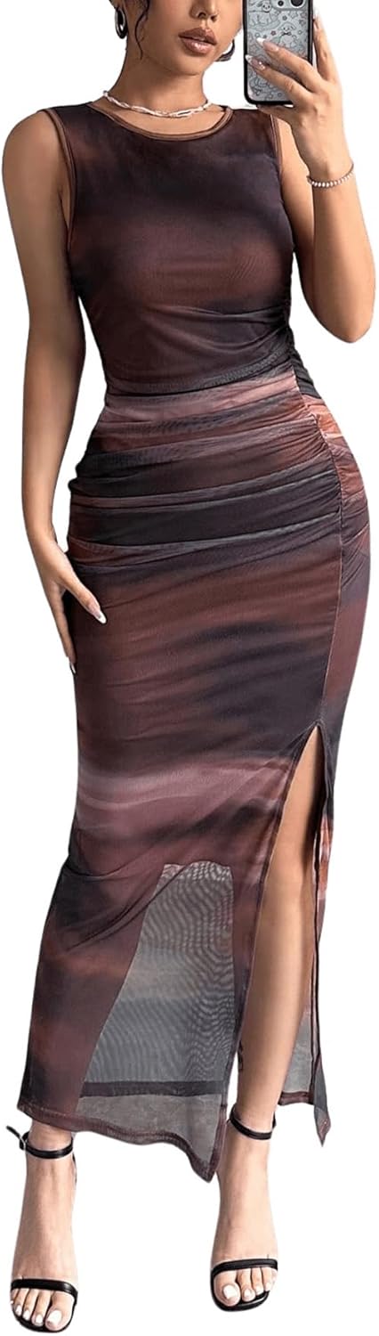 GORGLITTER Women's Tie Dye Mesh Bodycon Dress Ruched Split Thigh Party Maxi Dresses