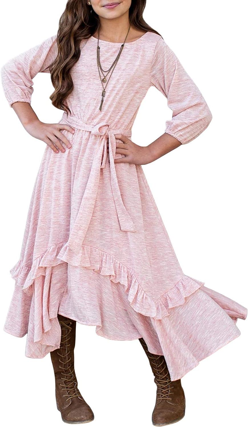 MITILLY Girls Loose Plain 3/4 Sleeve Casual Pocket Ruffle Swing Long Maxi Dress with Belt
